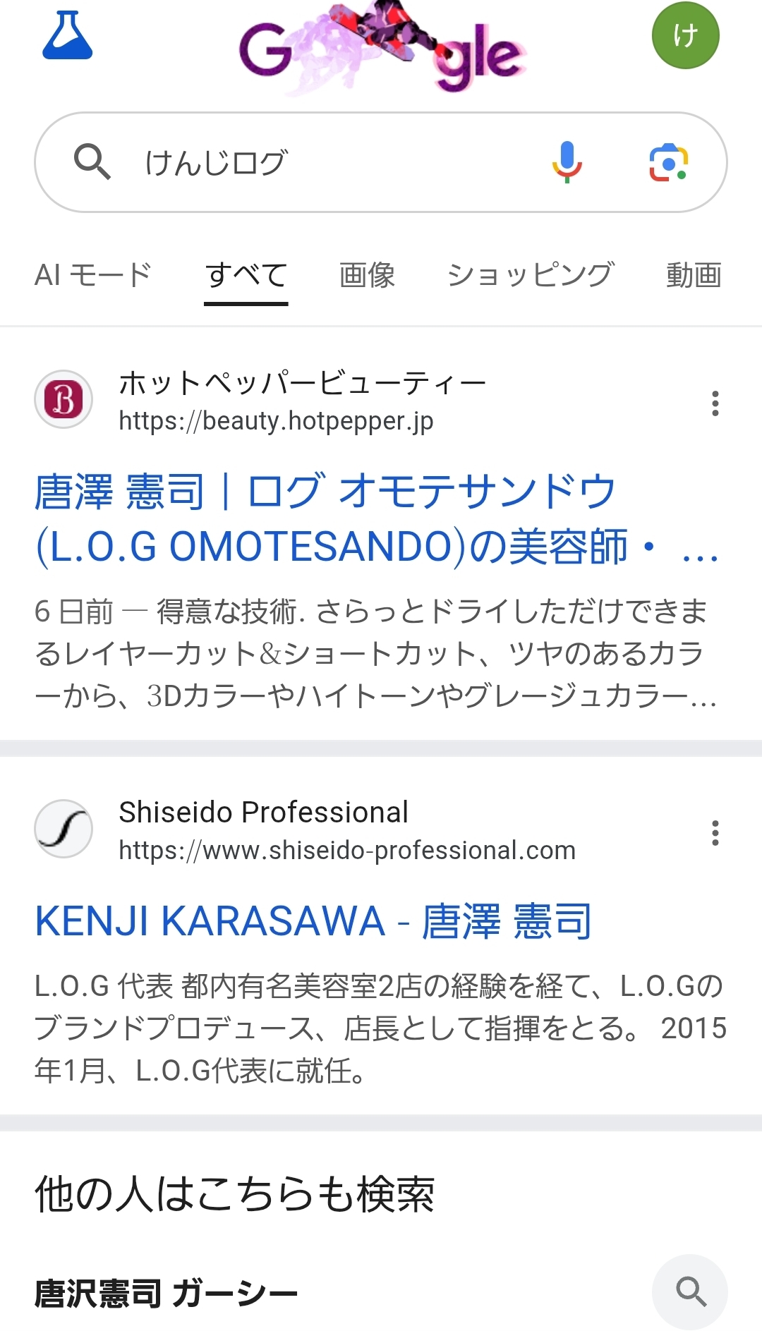 - 表参道のカリスマ美容師「けんじ」さんに検索画面をジャックされている。